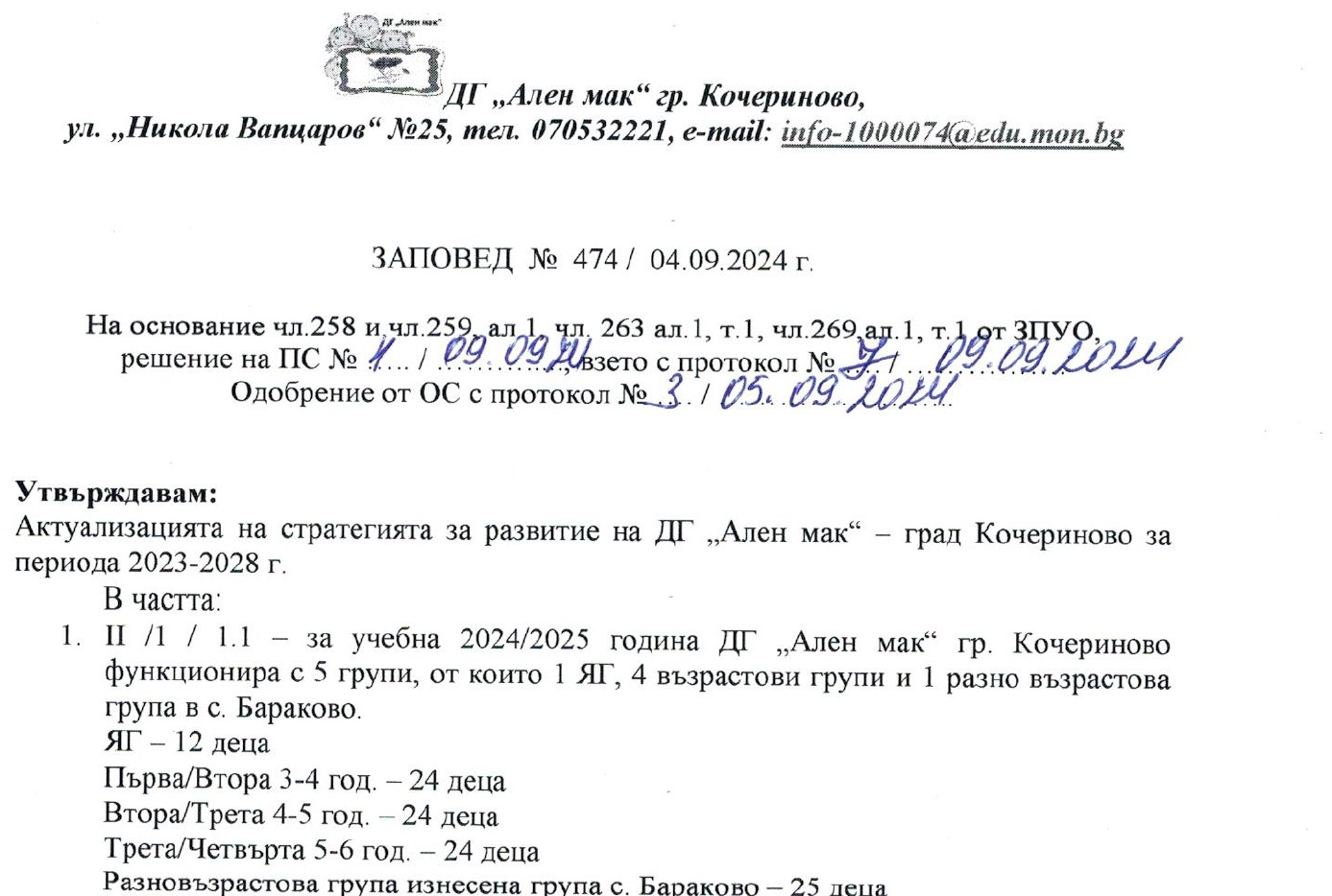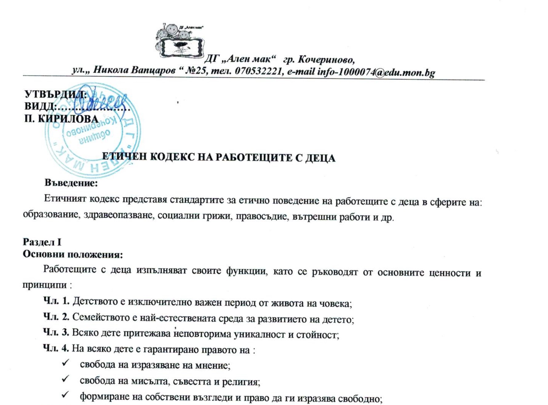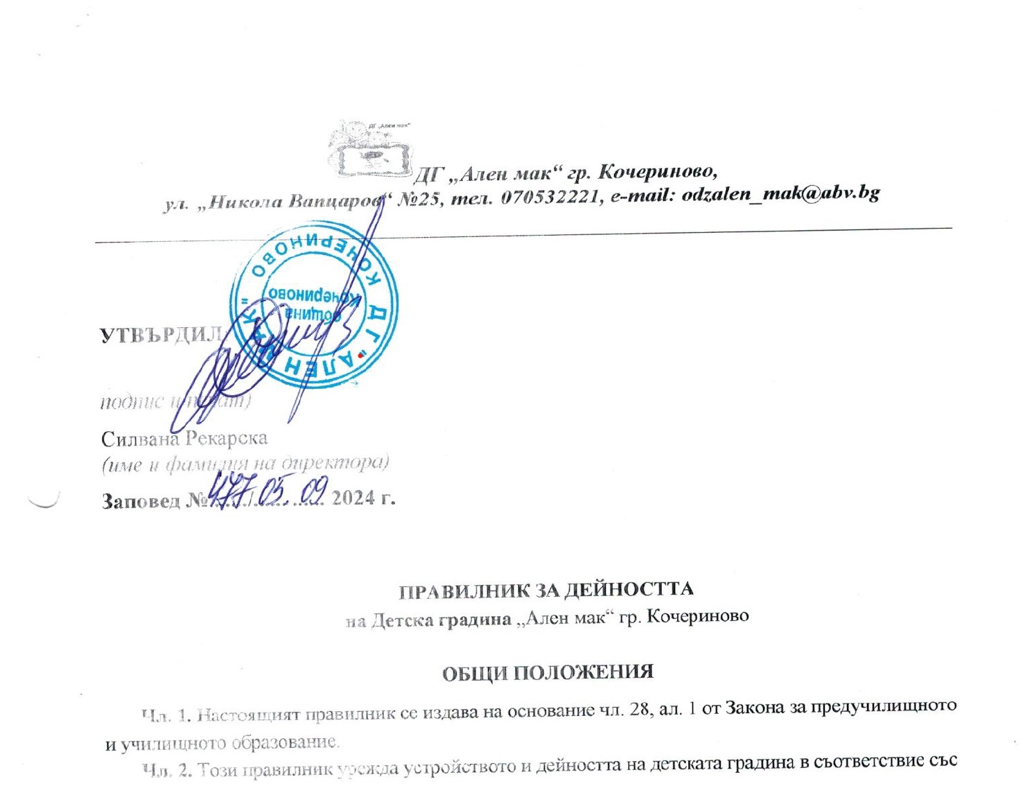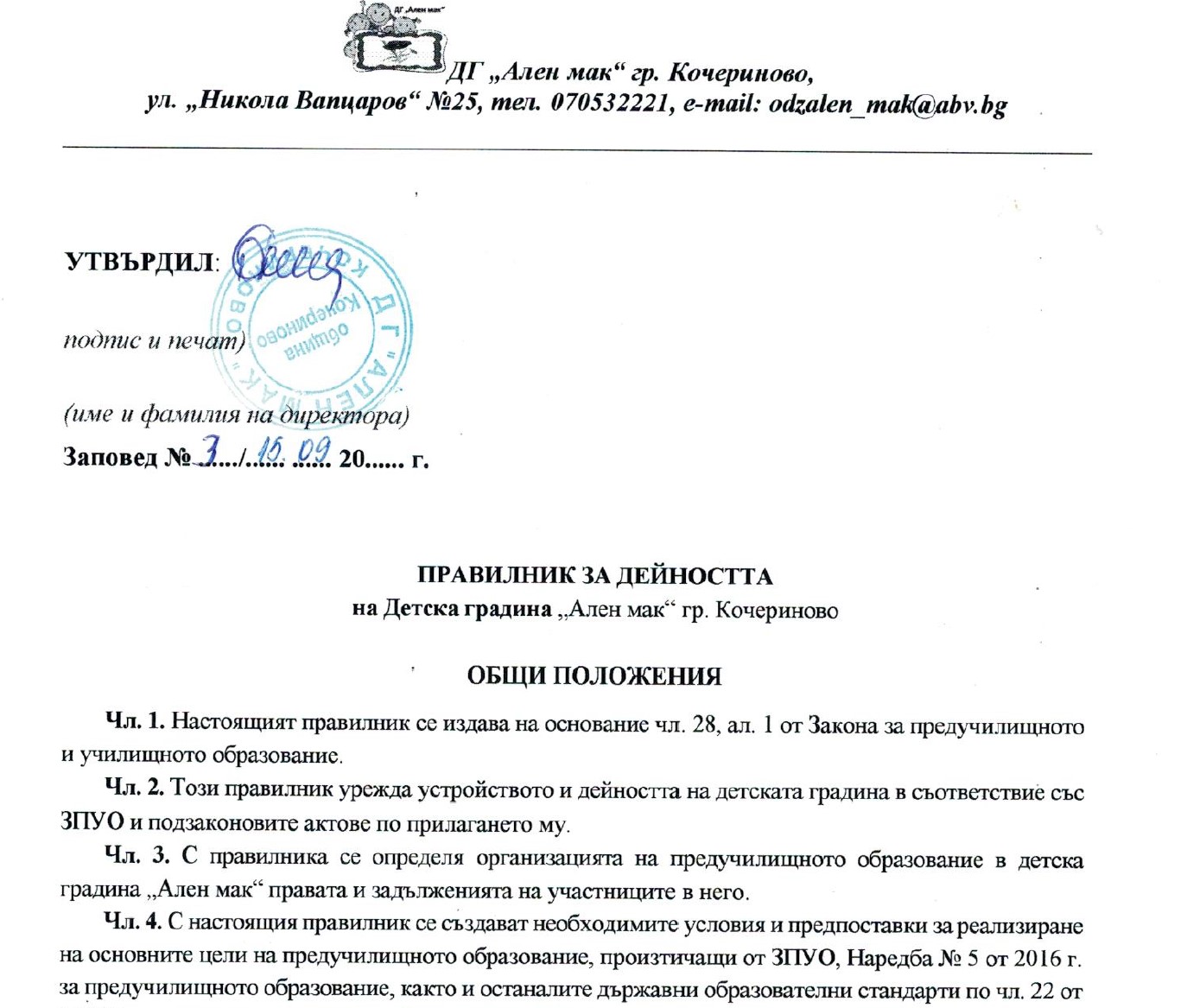 На основание чл.259 ал.1, във връзка с чл. 258 ал.1 и чл.266 ал.1 от ЗПУО, Протокол от общо събрание на родителите на децата от ДГ „ Ален мак ”, писмено уведомление от финансиращия орган с Изх.№ РД-01-05-390/02.09.2016г.