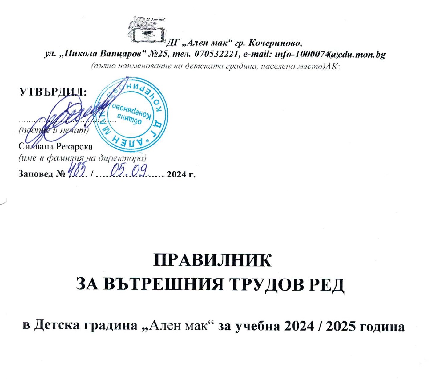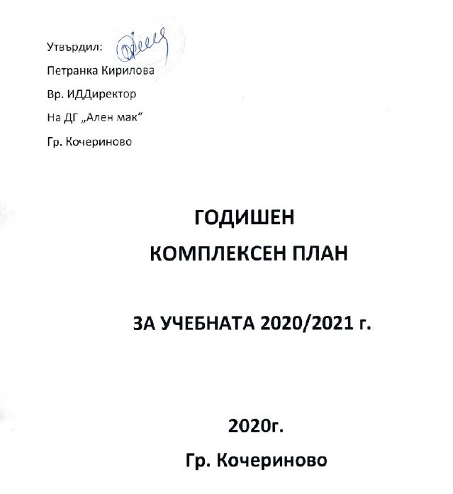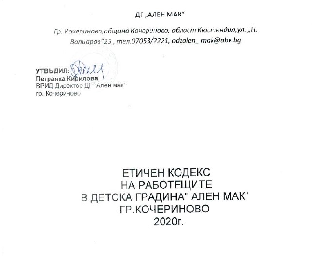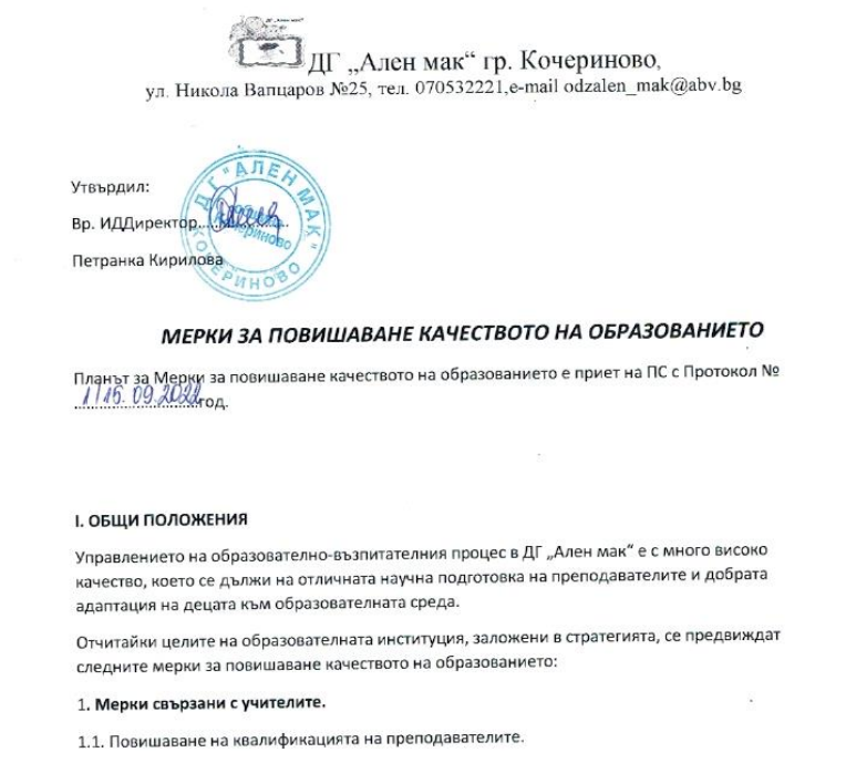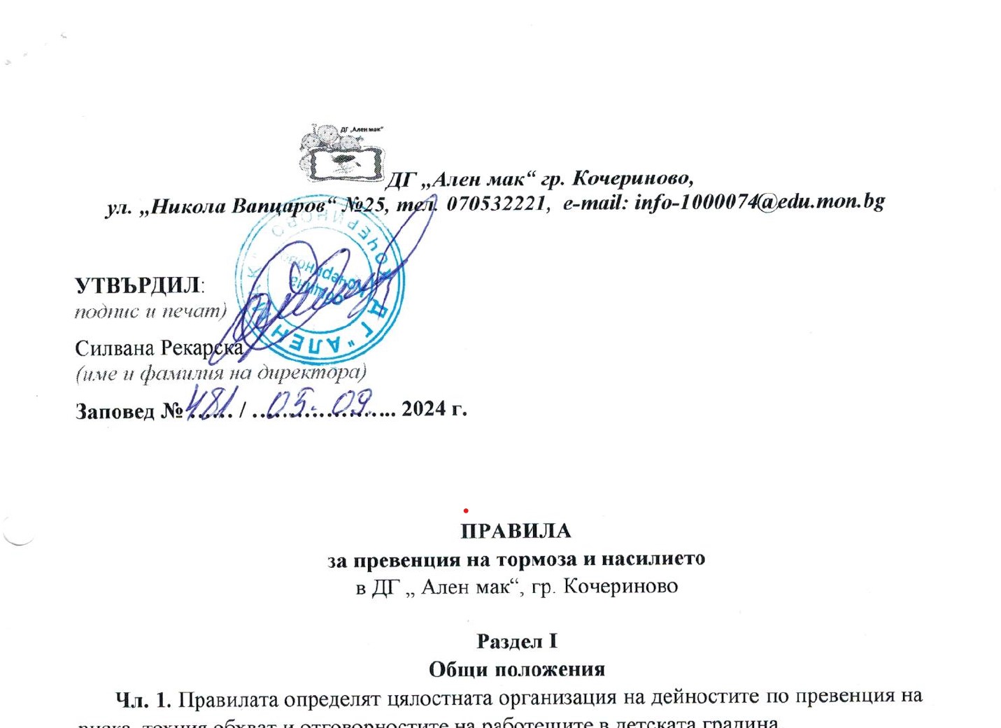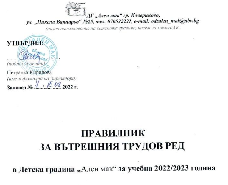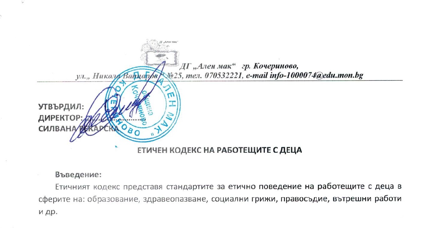 На основание чл.259 ал.1, във връзка с чл. 258 ал.1 и чл.266 ал.1 от ЗПУО, Протокол от общо събрание на родителите на децата от ДГ „ Ален мак ”, писмено уведомление от финансиращия орган с Изх.№ РД-01-05-390/02.09.2016г.